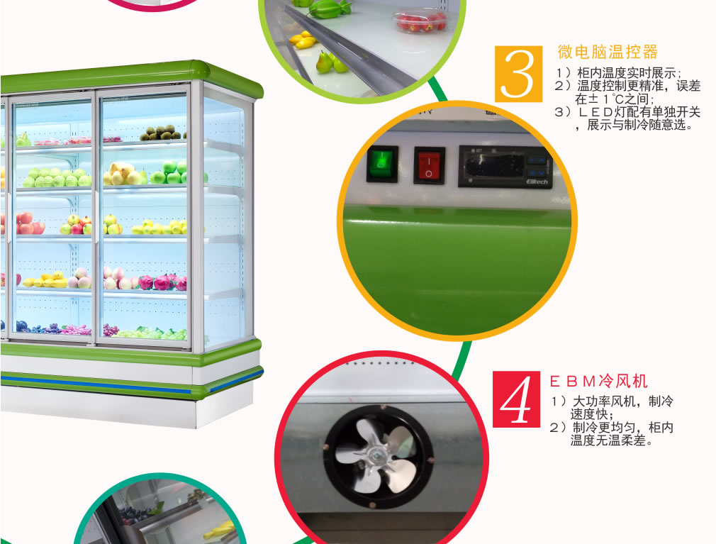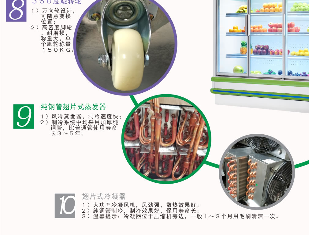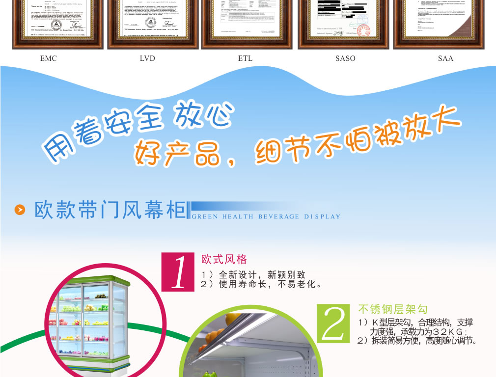 進口名牌機組,分體式機組,真正做到低噪音,高能效,環保節能,安全,穩定;冷柜結構緊湊,線條流暢,外觀豪華氣派,具有歐式風格; 流線型金屬邊條鑲嵌,不變形,耐腐蝕
