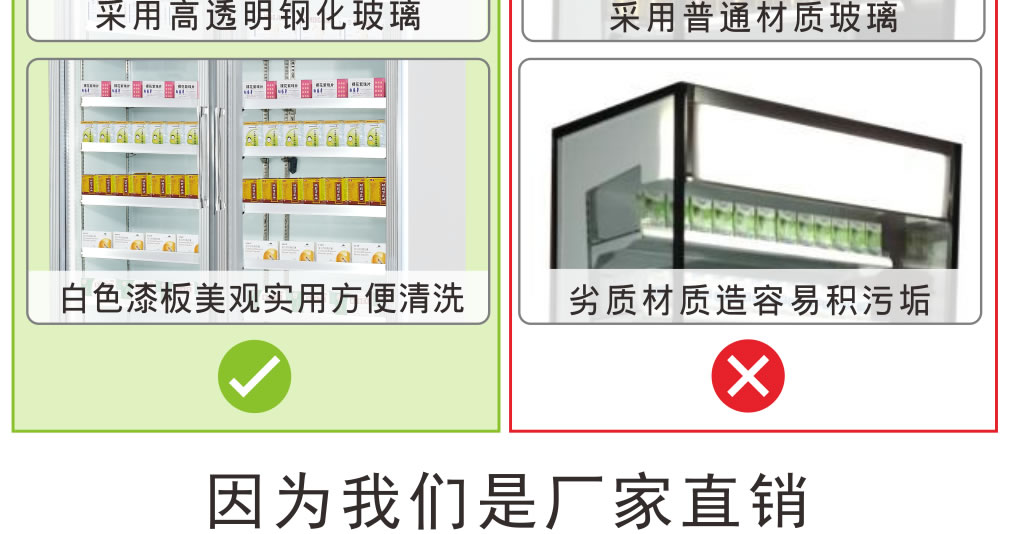 ③ 冷柜內外溫差較大時,遇空氣溫度較大的天氣時玻璃門上有水霧凝結,將溫度調整后即可。