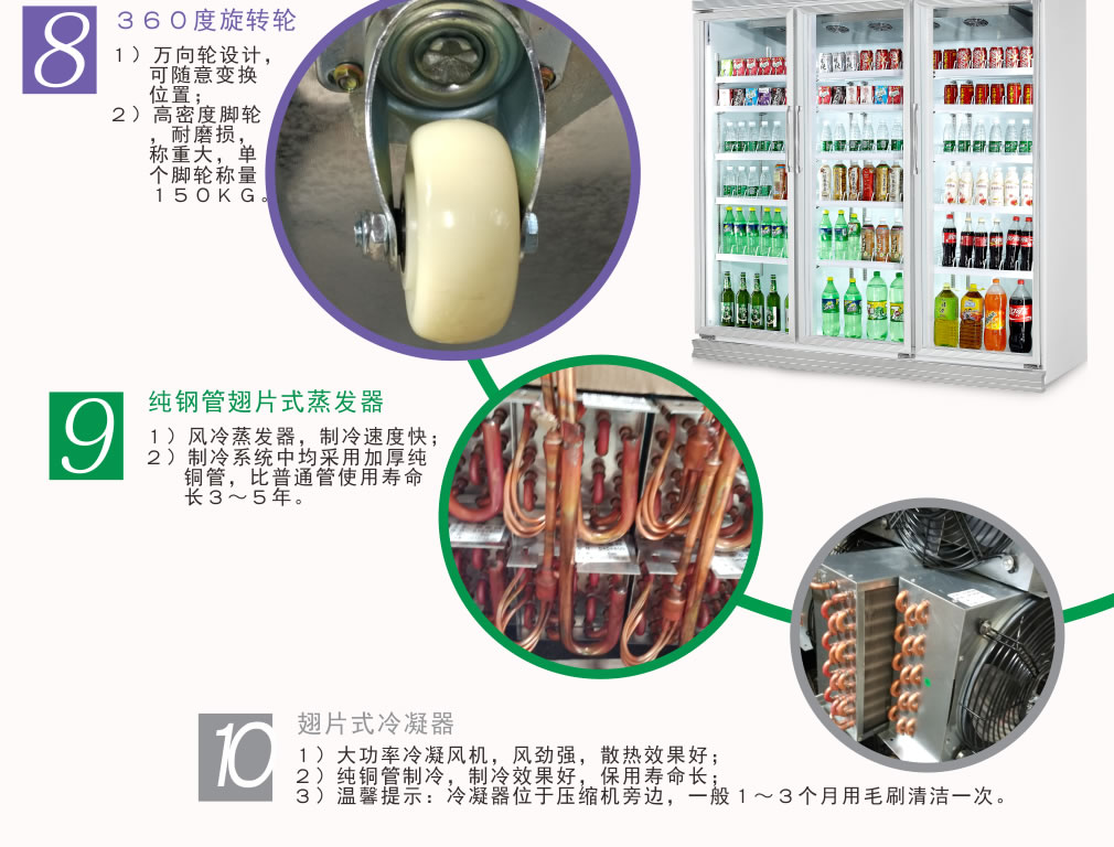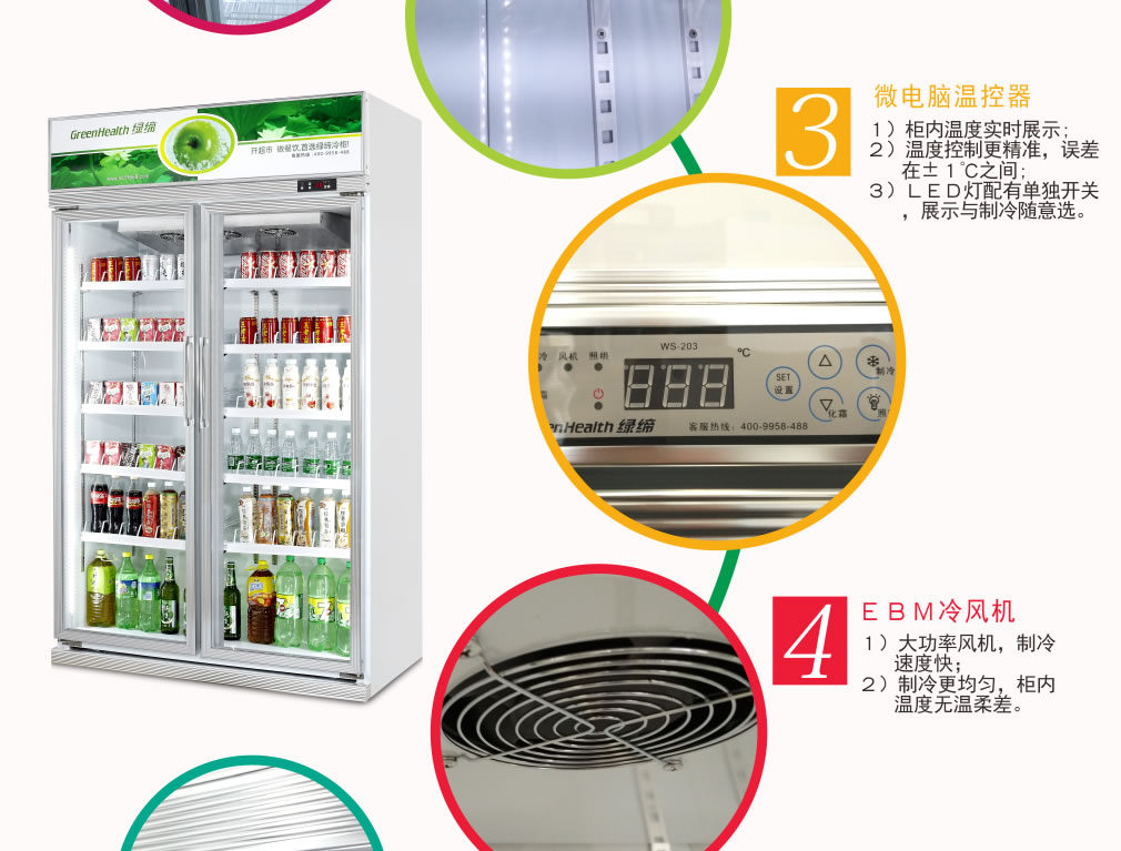 全封閉門封,不銹鋼層架勾,微電腦溫控器,EBM冷風(fēng)機,高強度門鉸,高亮度LED燈,雙層中空玻璃門,360度旋轉(zhuǎn)輪,純鋼管翅片式蒸發(fā)器,翅片式冷凝器
