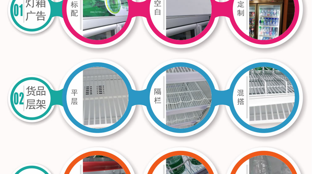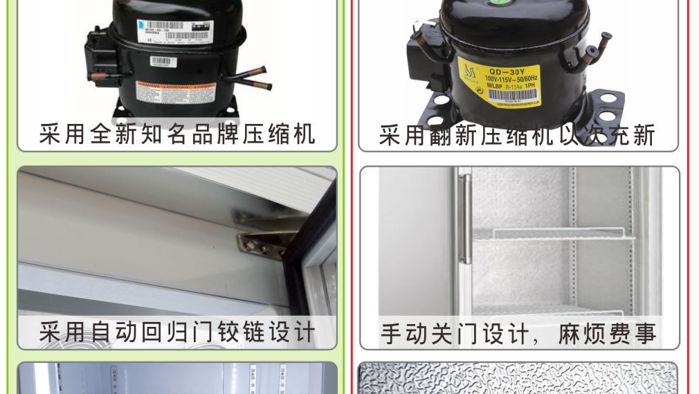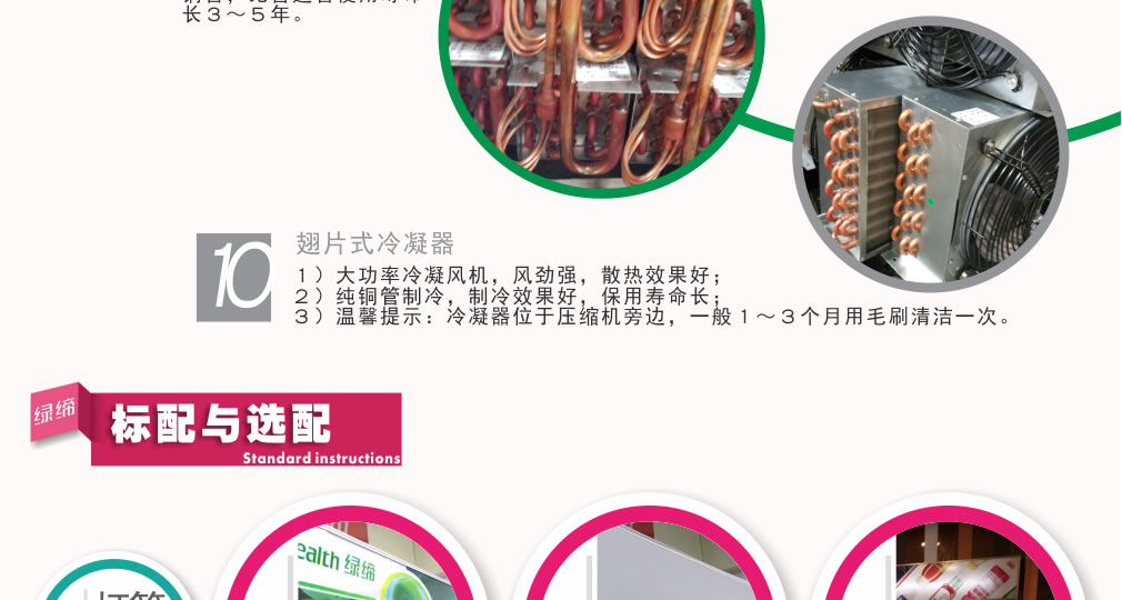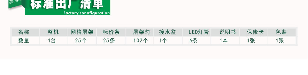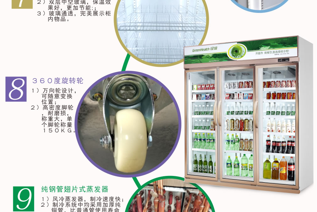全封閉門封,不銹鋼層架勾,微電腦溫控器,EBM冷風機,高強度門鉸,高亮度LED燈,雙層中空玻璃門,360度旋轉輪,純鋼管翅片式蒸發器,翅片式冷凝器