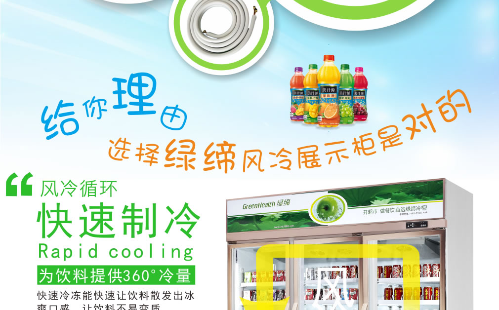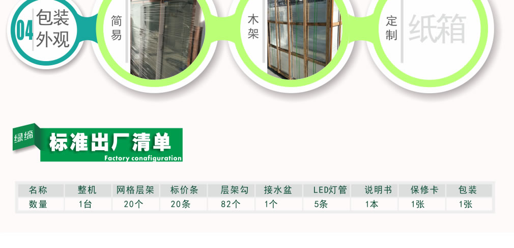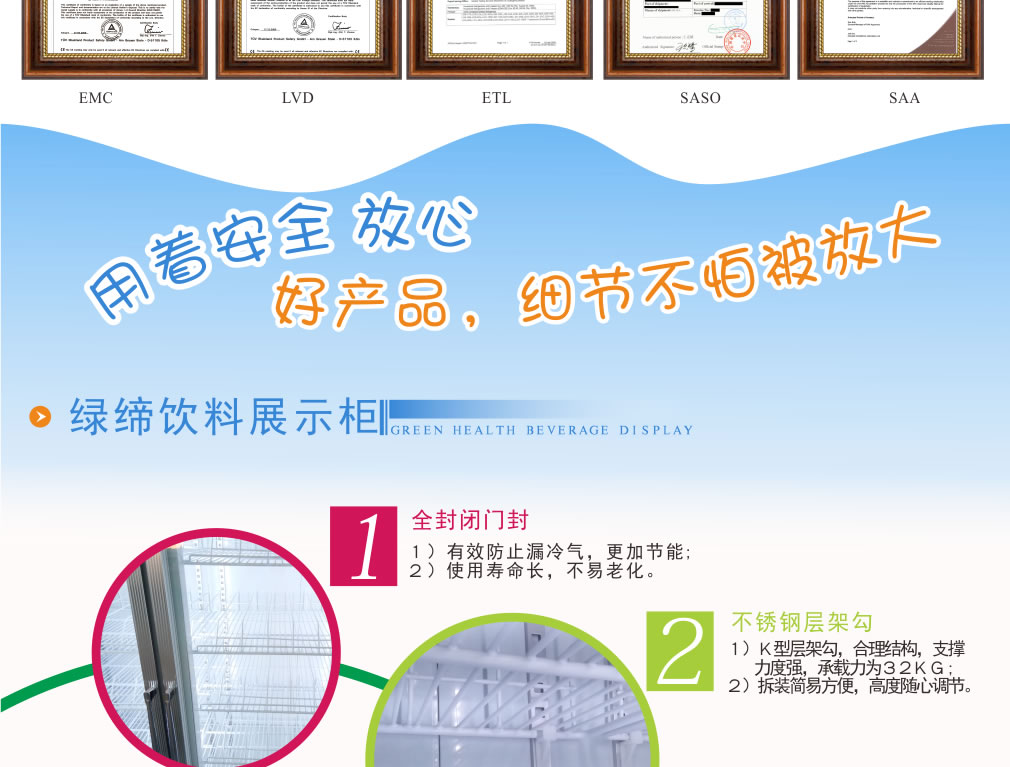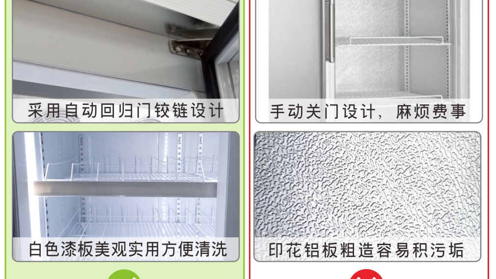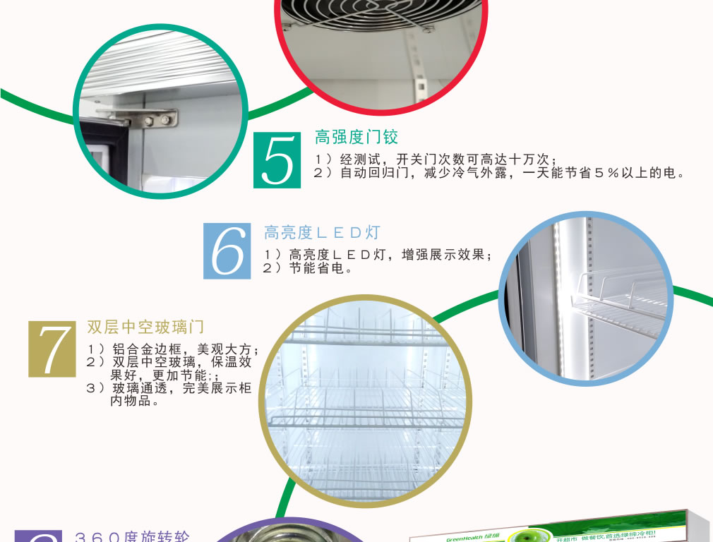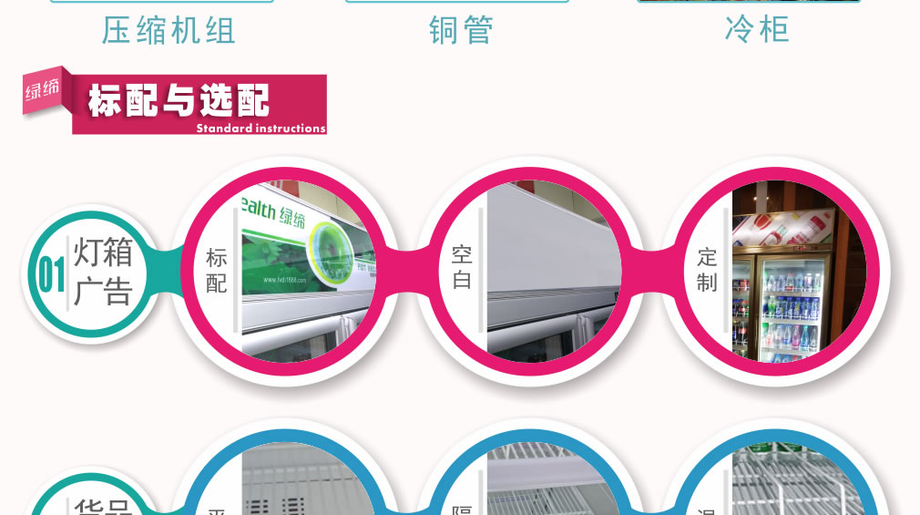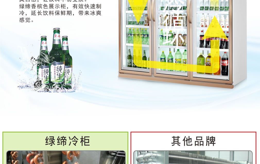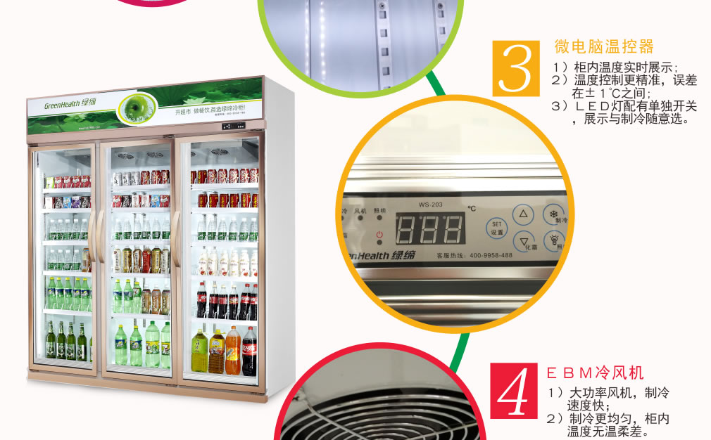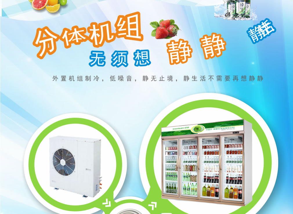 分體機組低澡音全封閉門封,不銹鋼層架勾,微電腦溫控器,EBM冷風機,高強度門鉸,高亮度LED燈,雙層中空玻璃門,360度旋轉(zhuǎn)輪,純鋼管翅片式蒸發(fā)器,翅片式冷凝器