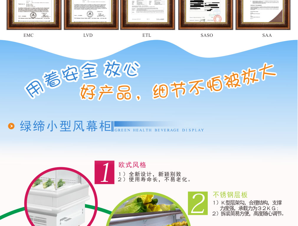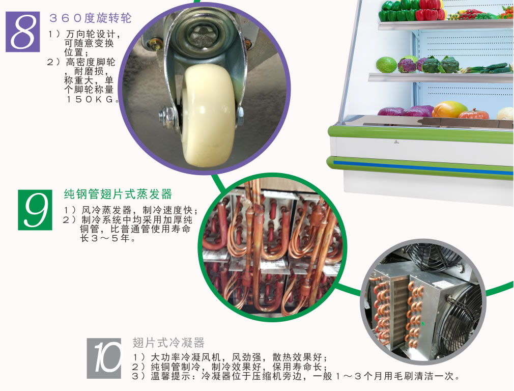 進口名牌機組,分體式機組,真正做到低噪音,高能效,環保節能,安全,穩定;冷柜結構緊湊,線條流暢,外觀豪華氣派,具有歐式風格; 流線型金屬邊條鑲嵌,不變形,耐腐蝕